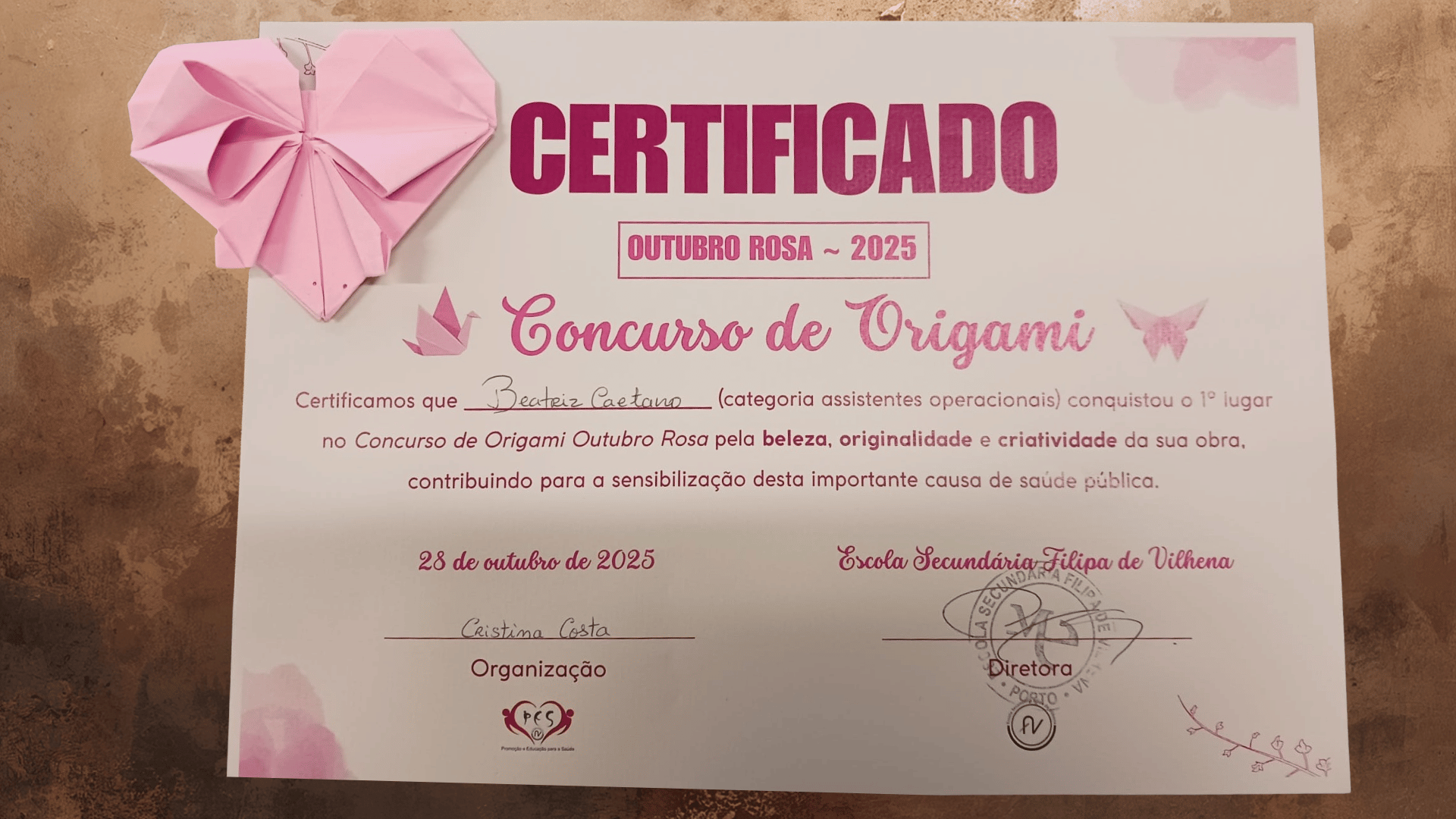 No âmbito das iniciativas assinaladas durante o Outubro Rosa, decorreu no passado dia 28 de outubro a entrega de prémios do Concurso de Origamis, uma atividade que contou com uma forte participação da comunidade educativa.